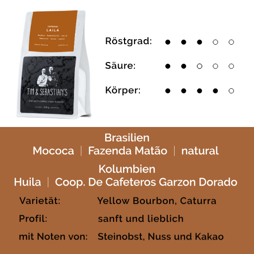 Bei dem Espresso LAILA wollen wir einen Kaffee kreieren, der sehr balanciert ist und eine Brücke schlägt zwischen hell und dunkel gerösteten Espressi.