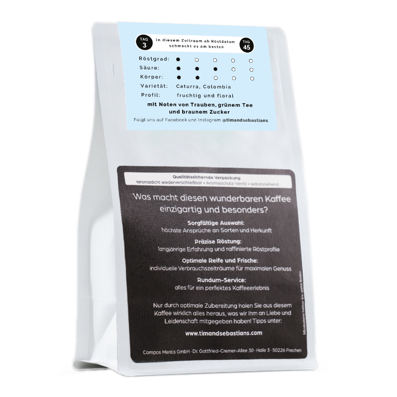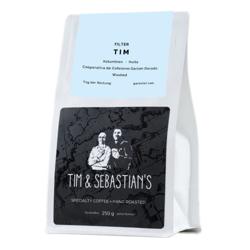 TIM ist eine helle Röstung von dem Caturra/Colombia aus Huila in Kolumbien. Der Kaffee wächst nahe der Stadt Garzon auf 1600m und wird nach der Ernte 20 Stunden fermentiert. Getrocknet wird der Kaffee 15-18 Stunden.
